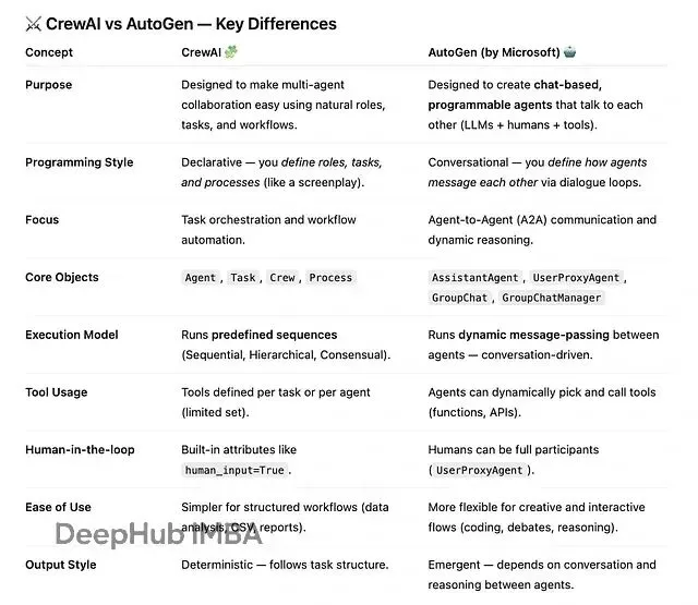 相比于CrewAI,AutoGen 则把重点放在讨论、推理和演化上,而CrewAI 更关注执行层面。