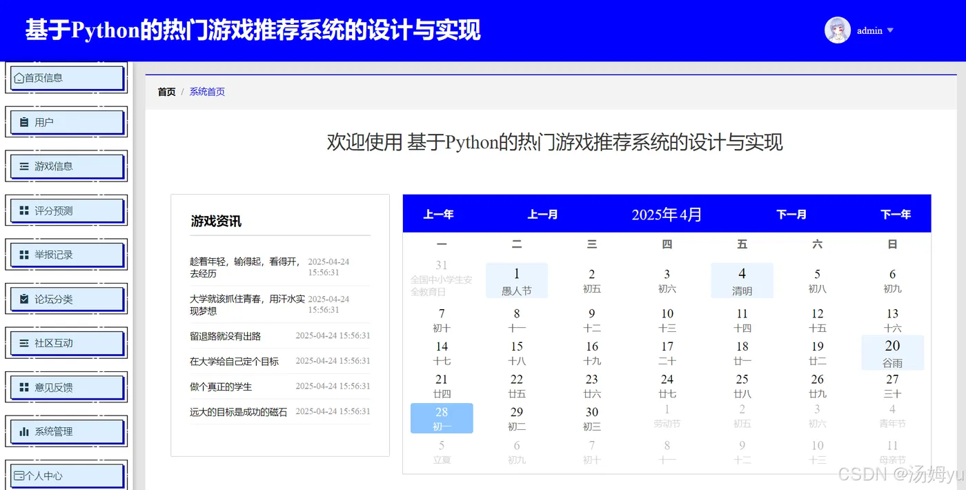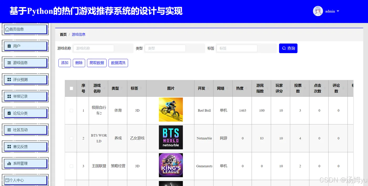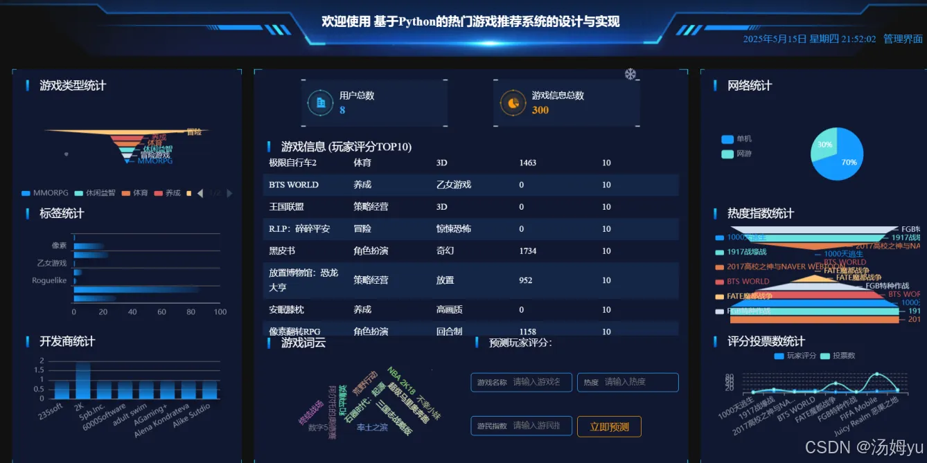 本研究运用Python技术栈构建高效、精准且可扩展的热门游戏推荐系统,致力于解决当前游戏产业中用户与海量游戏内容间的供需匹配失衡问题,以推动行业智能化升级。研究聚焦于用户侧体验优化与开发者运营支持两个层面: