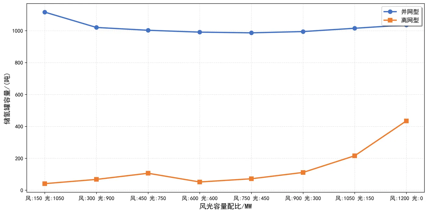 2)经系统容量调度优化分析发现,并网型系统在综合性能上更胜一筹。具体而言,离网型系统的合成氨平准化成本高达3807.16元/t,较并网型系统高出15.77%。这一差异主要源于离网型系统需配置更大容量的电解槽和储氢罐,同时还需配备蓄电池,从而增加了成本。