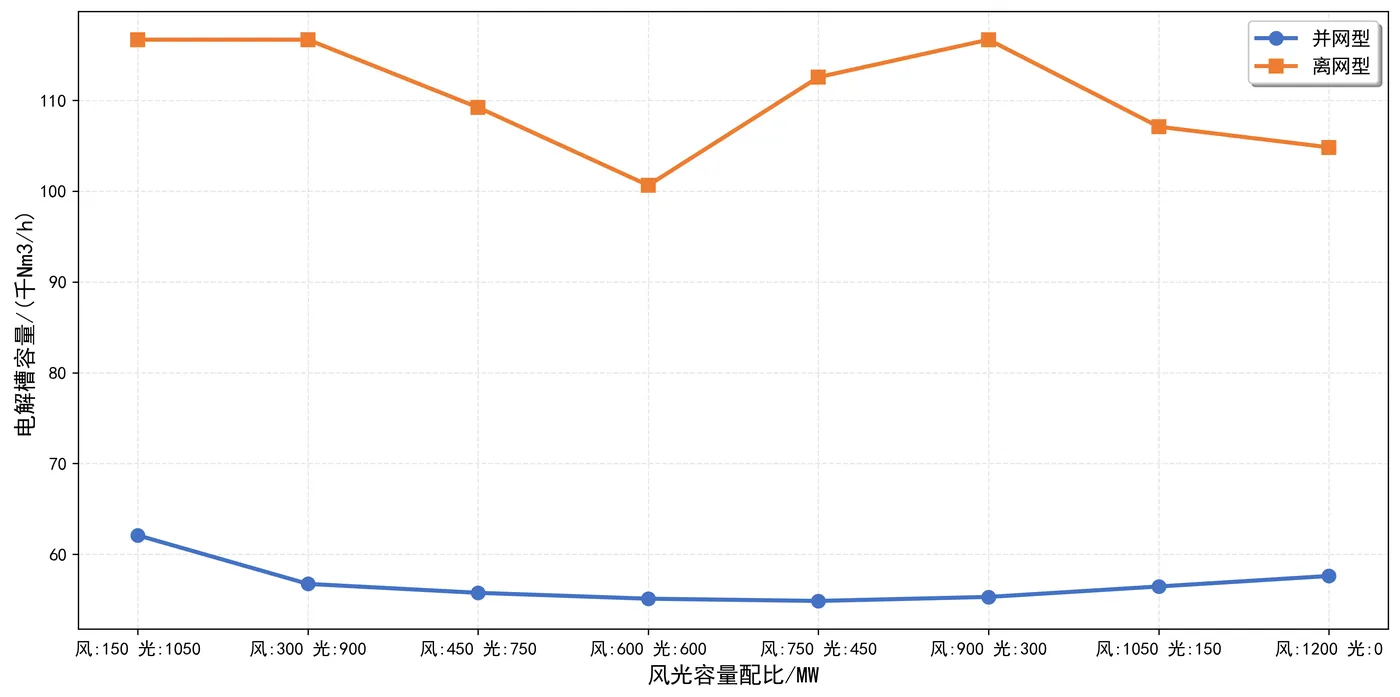 3)在本文所研究的内蒙古特定区域内,对于并网型系统而言,当风电装机容量略高于光伏装机容量时,系统的经济性能达到最优状态;而对于离网型系统,当风光容量相近或相等时,系统的经济性能最为出色。