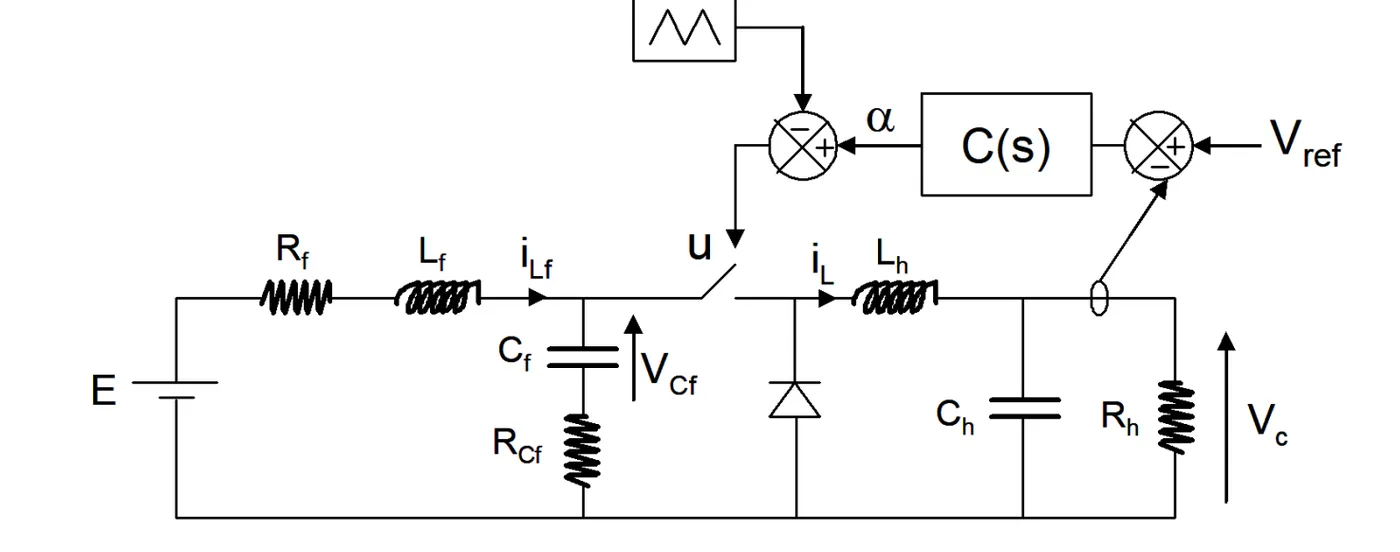 这个动态研究将涉及课程中讨论的带输入滤波器的串联斩波器的案例,其结构如下所示。同时也会提供这个斩波器的参数。
