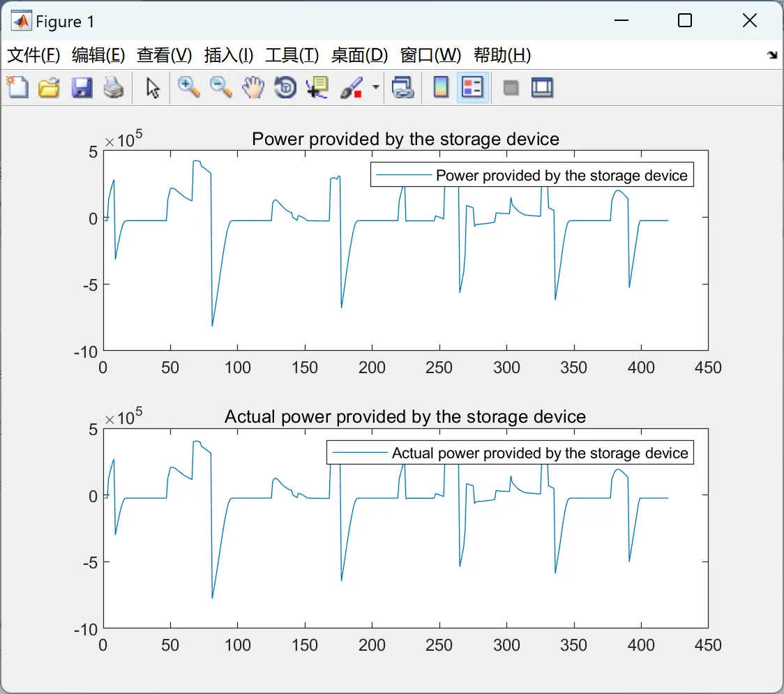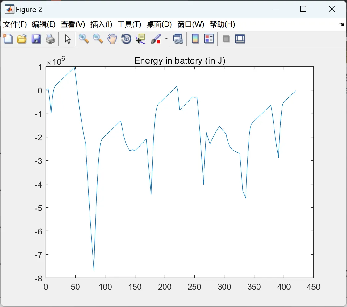 - 考虑到充电状态饱和,电池组中的储能。为此,我们将任务开始时的能量设为零。可以比较实际储存的能量和通过饱和积分计算的能量之间的差距。