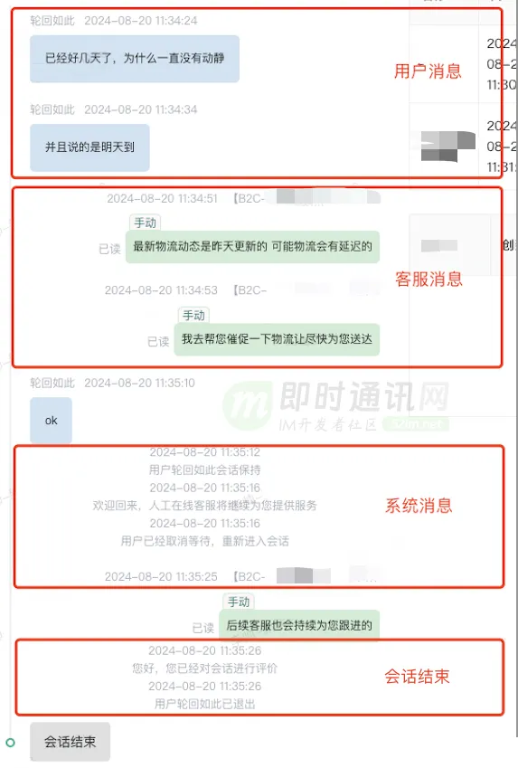 - 5)消息格式:用于描述用户/客服消息格式,如文本、图片、视频、订单卡片、优惠券等;