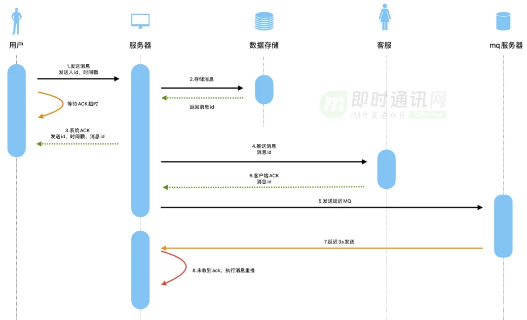- 5)当发送方没有在约定时间内收到ACK消息时,就需要执行失败消息处理逻辑:自动重发、客户端标记发送失败等。