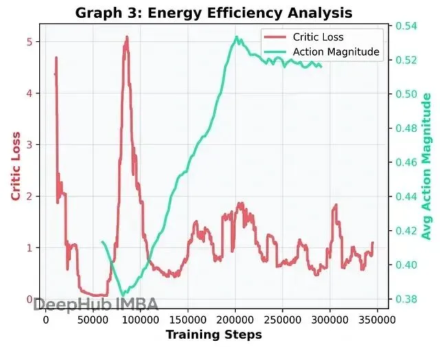 学习阶段(50k-200k步),Critic损失达到峰值,智能体还在跟物理规律较劲。极限环建立后(200k步以后),动作幅度稳定下来,Critic损失也降到较低水平。