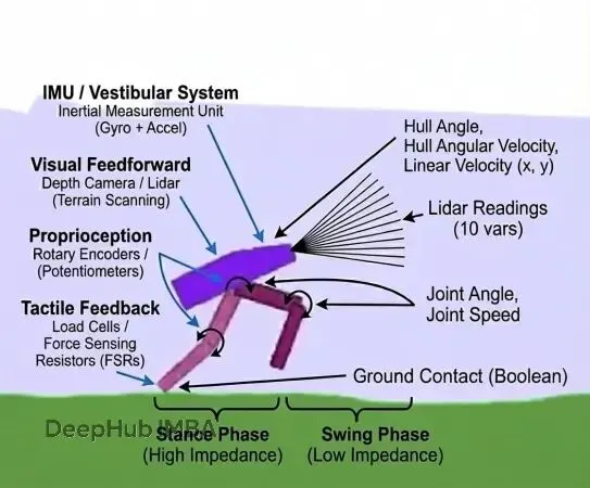 躯干角度和速度对应前庭系统——"躯干"代表质心位置,硬件上用IMU(惯性测量单元)采集平衡数据。关节编码器对应本体感觉,仿真里提供的关节角度和速度,在真实假肢上由霍尔传感器和旋转编码器获取。激光雷达对应视觉前馈,现代研究型假肢已经开始集成深度相机来预判地形。