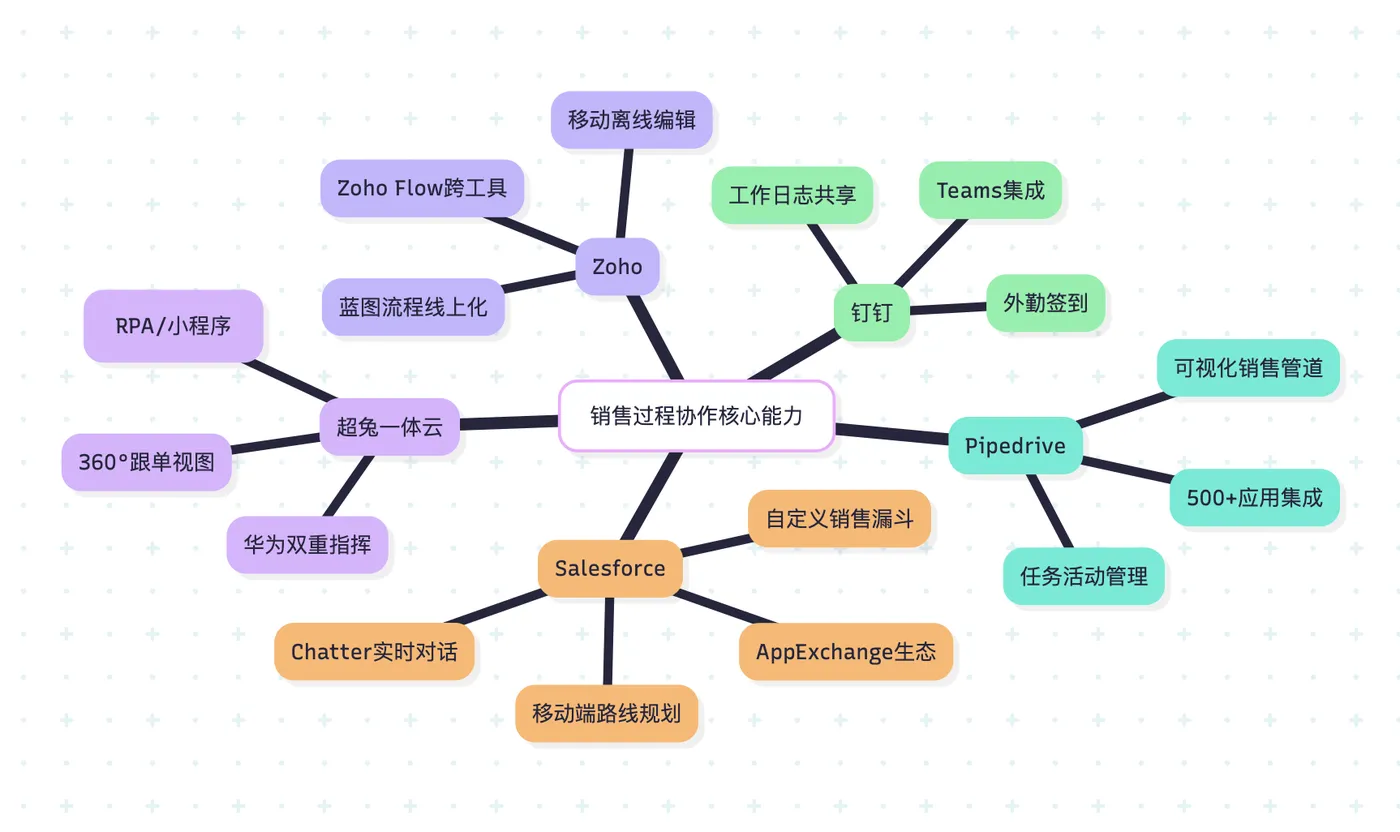 mindmap root(销售过程协作核心能力) Pipedrive 可视化销售管道 500+应用集成 任务活动管理 Salesforce 自定义销售漏斗 Chatter实时对话 移动端路线规划 AppExchange生态 超兔一体云 360°跟单视图 华为双重指挥 多端同步(RPA/小程序) 钉钉 外勤签到 Teams集成 工作日志共享 Zoho 蓝图流程线上化 Zoho Flow跨工具 移动离线编辑