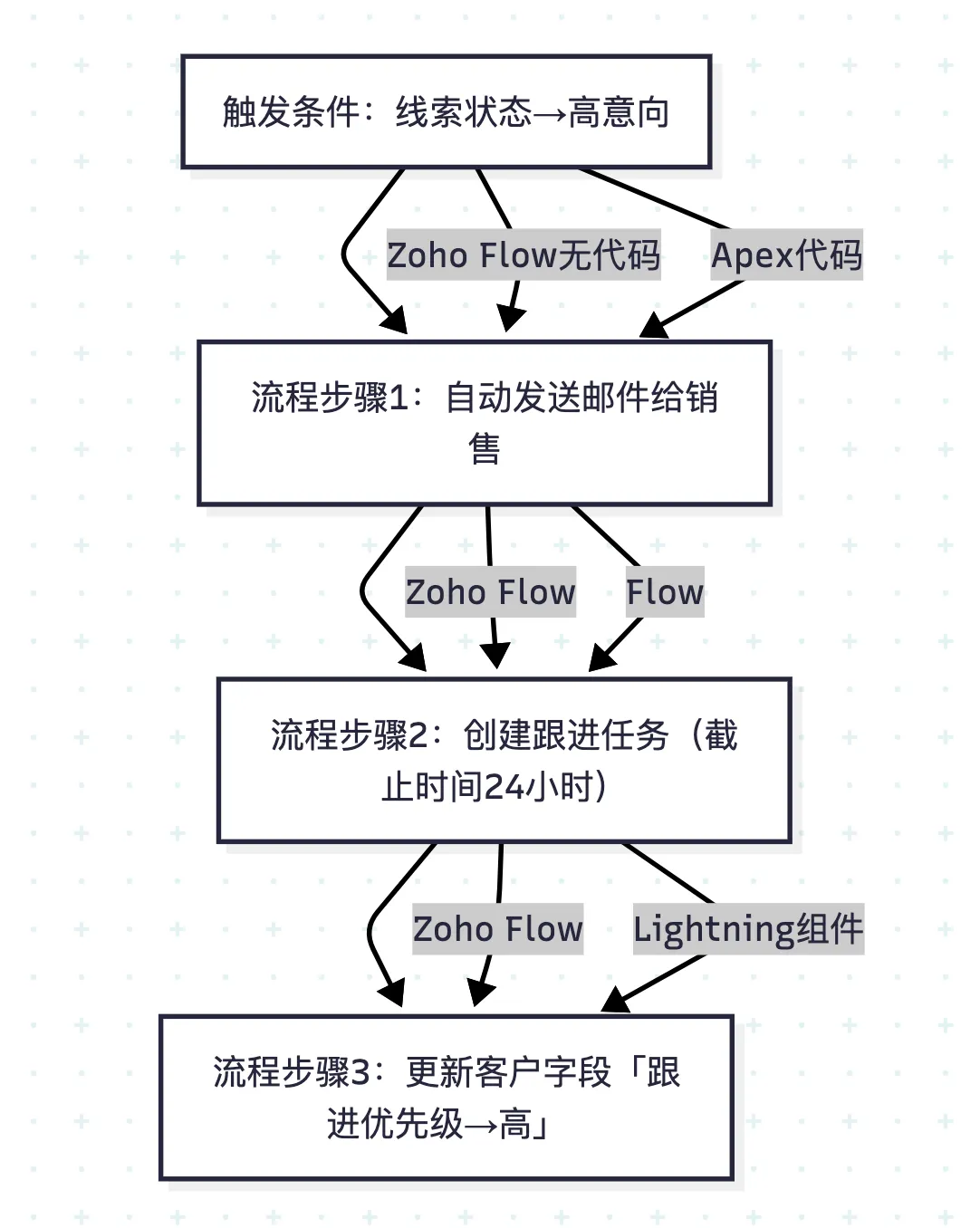 flowchart TD A[触发条件:线索状态→高意向] --> B[流程步骤1:自动发送邮件给销售] B --> C[流程步骤2:创建跟进任务(截止时间24小时)] C --> D[流程步骤3:更新客户字段「跟进优先级→高」] %% Zoho Flow配置 A -->|Zoho Flow无代码| B B -->|Zoho Flow| C C -->|Zoho Flow| D %% Salesforce配置 A -->|Apex代码| B B -->|Flow| C C -->|Lightning组件| D