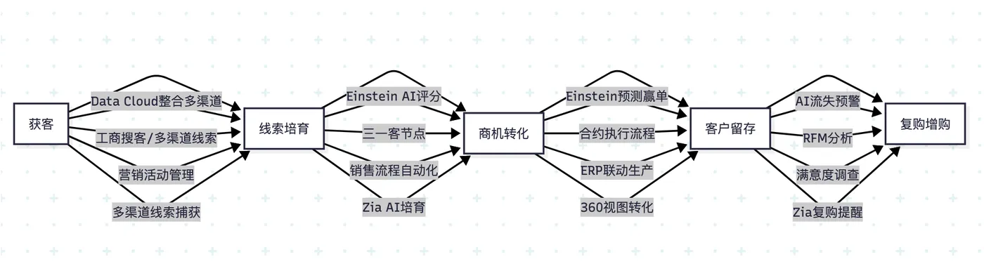 覆盖「多渠道获客→三一客节点跟进→合约执行→RFM复购」 |