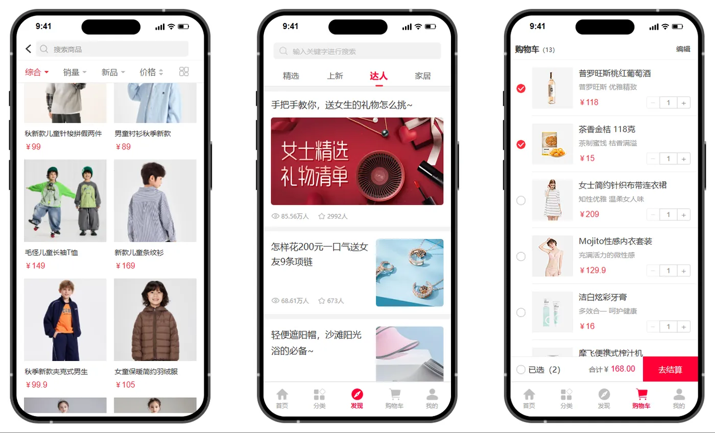 购物车流程是电商购物 APP 的核心环节之一,该原型在这方面表现出色。用户可以在购物车中方便地增删商品,进行批量结算。价格计算功能准确无误,能够实时显示商品总价、优惠金额等信息。优惠券抵扣功能让用户在购物时能够享受更多实惠,订单结算页面模拟了真实的支付场景,支持多种支付方式(如模拟支付宝/微信),为用户提供了便捷的支付体验。