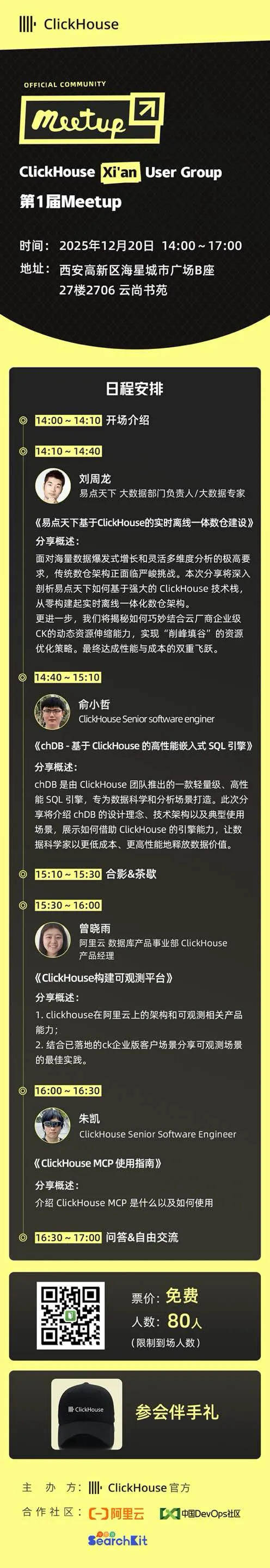 诚邀您参加ClickHouse 线下Meetup—西安站,聚焦核心技术和实战案例,邀您共探未来新机遇,还有精美伴手礼等你来拿!点击链接立刻报名:https://www.huodongxing.com/event/8834026555300