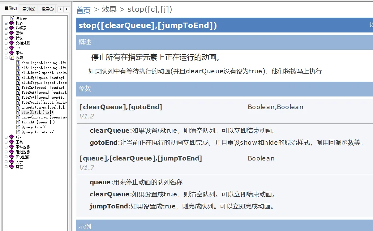 在jquery1.11.3版本中stop()方法有两个参数 : [clearQueue],[gotoEnd] 值为布尔值