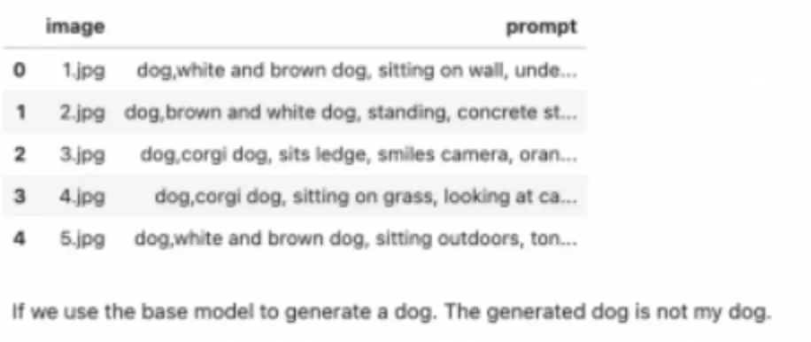 训练前,先用基座模型输出“a dog” 的结果。可见输出为通用狗狗,而非目标个体。