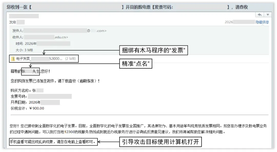 攻击者不再群发泛泛的“中奖通知”,而是利用非法获取或推测的个人信息,将邮件主题定制为“【电子发票】张某某先生,您的发票已开好”。这种包含真实姓名的个性化内容,极大降低了受害者的警惕性。同时,他们伪装成电信运营商、电商平台或旅游平台客服,利用岁末年初报销封账的时间窗口,在正文中强调“逾期作废”“发票有误需重开”等字样,制造心理紧迫感,迫使受害者在未及深思的情况下点击链接或附件。