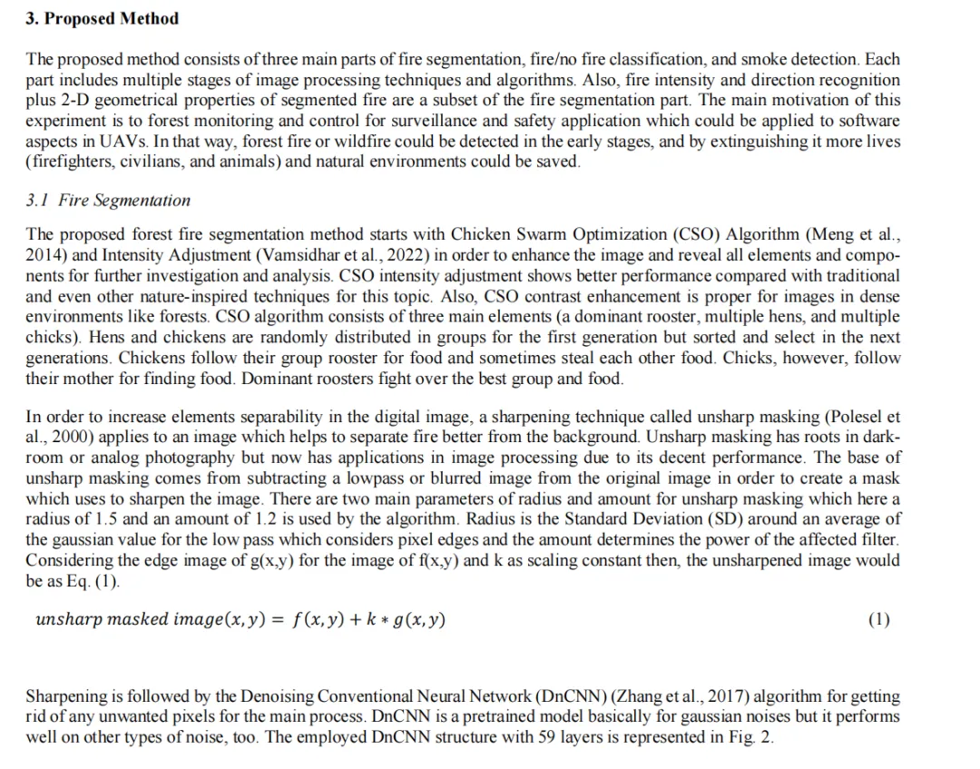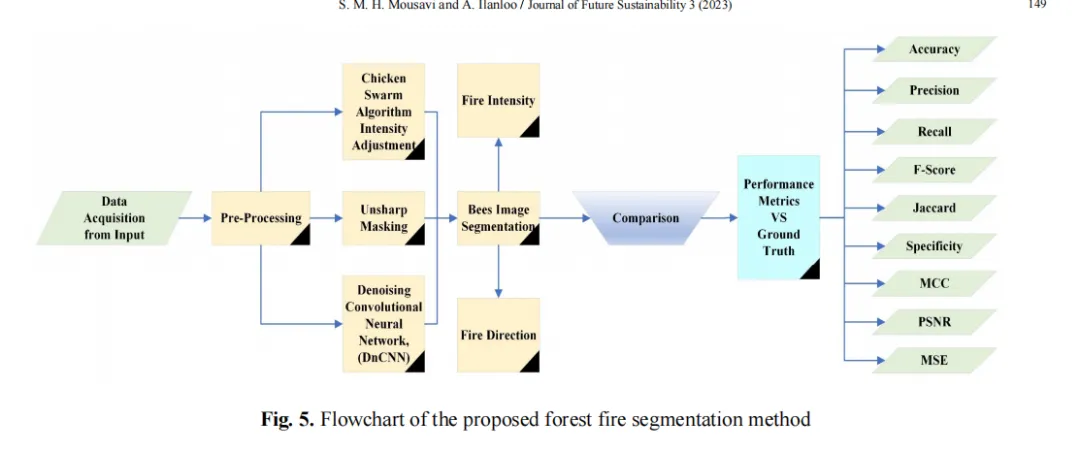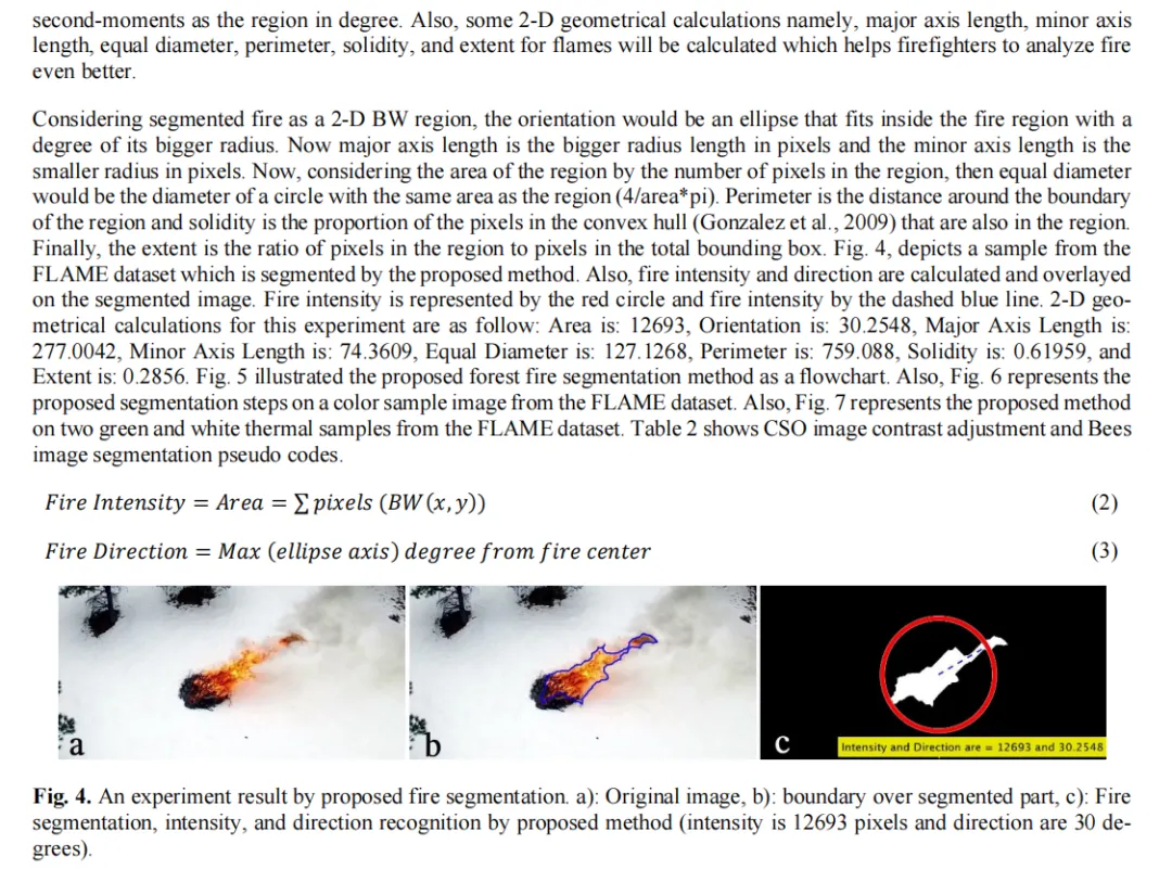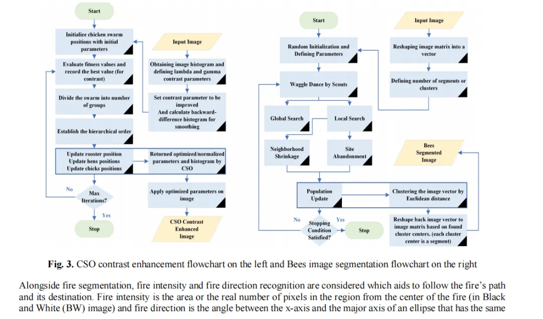 森林中最危险的现象之一是野火或灌木丛火灾,早期发现并预防大规模破坏至关重要。将无人机(UAV)作为视觉监测与灭火工具,以避免这场对人类和野生动物造成致命影响的灾难,具有重要意义。此外,利用航空影像技术可协助消防员识别火势强度、定位并引导火势在森林中的蔓延路径,从而降低消防人员伤亡风险。所有这些优势均可通过采用低成本无人机实现。本研究采用仿自然图像处理技术,对彩色与热成像图像中的火灾进行分割与分类。研究整合了多种仿自然与传统计算机视觉技术,包括鸡群算法(CSA)强度调整(对比度增强)、去噪卷积神经网络(DnCNN)、局部相位量化(LPQ)特征提取、蜜蜂图像分割、基于生物地理学的优化(BBO)特征选择、萤火虫算法(FA)分类等,以实现高精度分类与分割效果。系统在分割阶段评估了F值、准确率、杰卡德系数等九项性能指标,在分类阶段评估了四项性能指标。所有实验均基于最新发布的两个无人机火灾数据集——火焰数据集(2021年)和DeepFire数据集(2022年)进行。此外,系统还计算了火势强度、火势方向及火势几何参数,为消防人员提供更精准的决策支持。鉴于烟雾能直观显示火源位置,我们同步开发了烟雾检测工作流程。与传统及创新分割分类方法相比,该系统在几乎所有评估指标上均取得令人满意且具有前景的成果。其训练模型可实时应用于当前主流救援无人机系统。在火焰数据集(彩色数据)中,分割精度达95.57%,分类准确率达91.33%;而在DeepFire数据集上,分割精度提升至91.74%,分类准确率更达到96.88%。