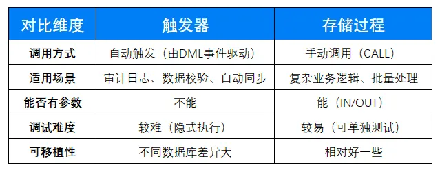 - 需要“主动调用” → 存储过程