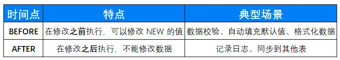- BEFORE 用于校验和修改,AFTER 用于记录日志和同步
