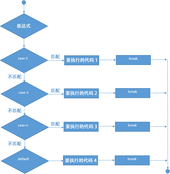 - 一个 switch 语句的末尾可以有一个可选的 default(默认选项),当所有 case 语句都不能与表达式相匹配时则会执行 default 部分中的代码,而且 default 中的 break 语句可以省略;