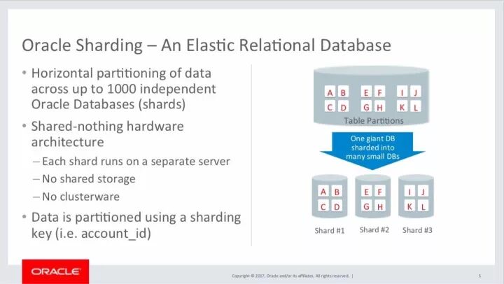 除此之外,Oracle数据库本身也有自己的分布式方案Sharding,Oracle Sharding 可以被看做是一个 Shared-Nothing 架构的弹性关系型数据库。每个分片存储全局表的局部数据,依托原有的分区技术,实现数据的拆分。
