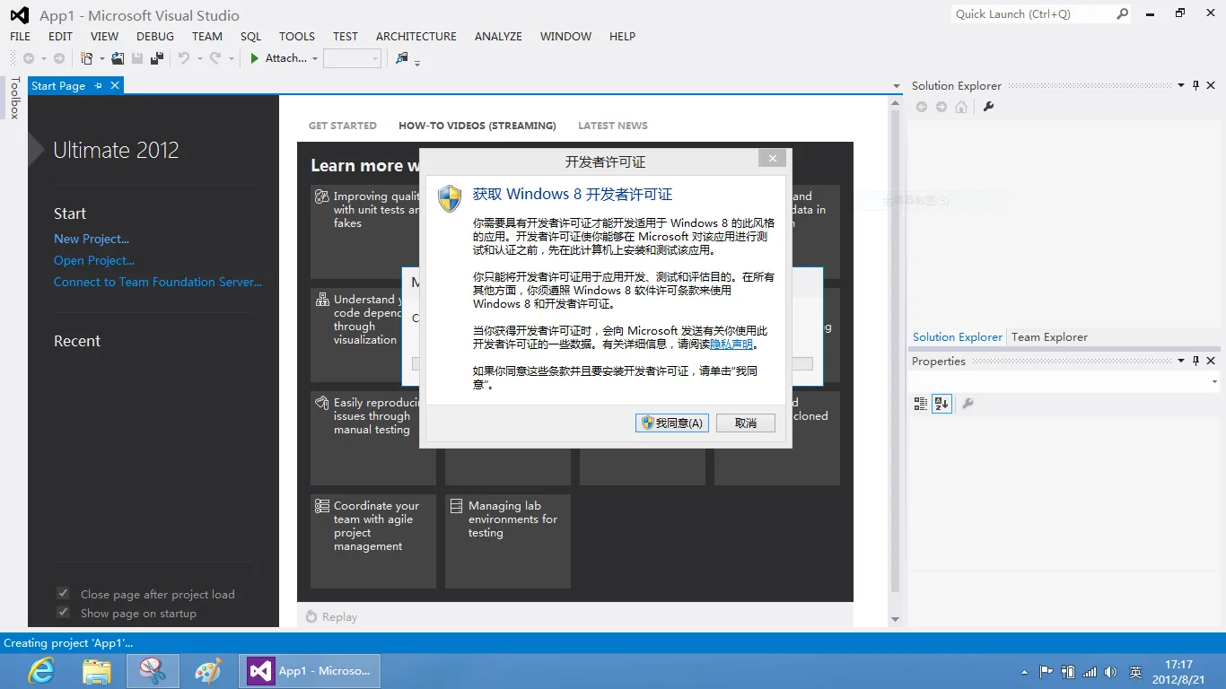 步骤11:弹出获取Windows 8 开发者许可证,点击我同意