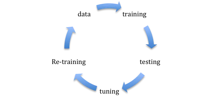 data--> training --> testing --> tuning --> re-training --> more data --> loop again
