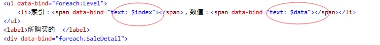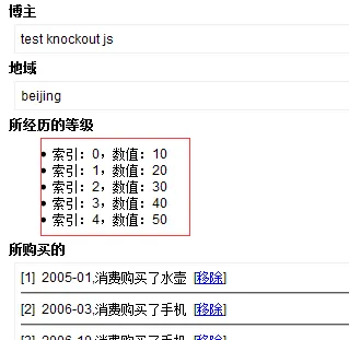 <label>博主</label> <div data-bind="text:User.title"></div> <label>地域</label><div data-bind="text:User.address"></div> <label>所经历的等级 </label> <ul data-bind="foreach:Level"> <li>索引:<span data-bind="text: $index"></span>,数值:<span data-bind="text: $data"></span></li> </ul> <label>所购买的 </label> <div data-bind="foreach:SaleDetail"> [<span data-bind="text:id"></span>] <span data-bind="text:memo"></span> [<a href="javascript:;" data-bind="click:$parent.remove">移除</a>]<hr /> </div> <script type="text/javascript"> var Demo = function () { var self = this; self.User = { title: "test knockout js", address: "beijing" }; self.Level = [10, 20, 30, 40, 50]; self.SaleDetail = ko.observableArray([ { id: 1, memo: '2005-01,消费购买了水壶' }, { id: 2, memo: '2006-03,消费购买了手机' }, { id: 3, memo: '2006-10,消费购买了手机' } ]); for (var i = 0; i < 5; i++) { self.SaleDetail.push({ id: i + 4, memo: '2005-01,消费购买了水壶' }) } self.remove = function () { self.SaleDetail.remove(this); } } ko.applyBindings(new Demo()); </script>