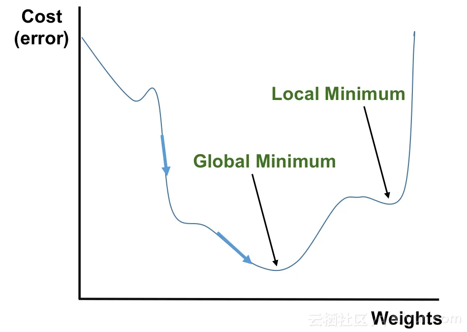 训练深度学习的最终目的是降低代价函数,即期望输出与实际输出之间的差异尽可能小。节点之间的连接将会有特定的权重,不断修改这些权重参数使得网络的代价函数变小。通过修改权重值,可以将代价函数最小化到全局最小值,这意味着模型的误差降到最小值。深度学习之所以计算如此密集就是因为它需要找到合适的数以十亿的连接权重值,这需要通过不断迭代训练调整得到,以找到使得代价函数全局最小值的权重集。