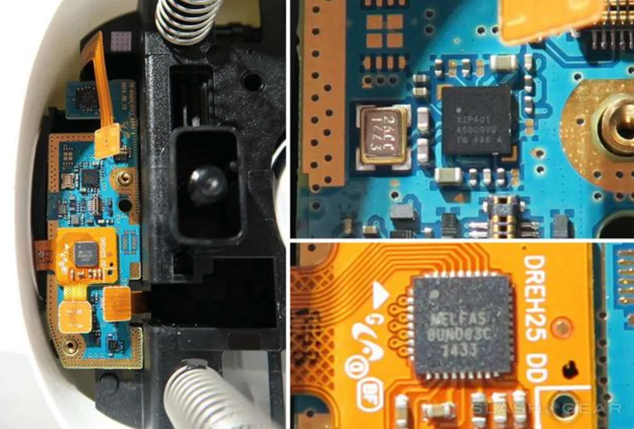 在触摸控制板组件的中央,你会看到MELFAS BUNO83C 1433的字样,这表明三星使用的是Melfas的触控面板。实际上,包括Gear 2、Galaxy S3、Galaxy Nexus和Gear Fit在内的多款三星设备使用的都是这一组件。
