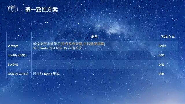 如果对一致性要求不高,可以选择以 DNS 为基础的方案,也可以像新浪微博的 Vintage 一样基于 Redis 。