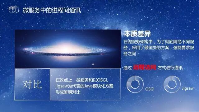 在这点上,微服务和以OSGi、jigsaw为代表的Java模块化方案形成鲜明对比。
