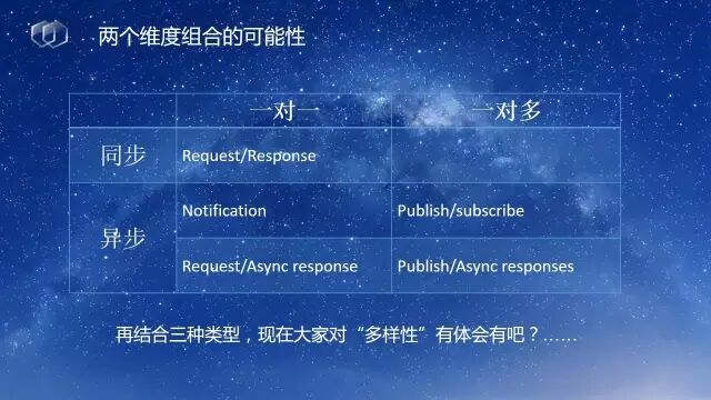 - 交互方式有两个维度:按照交互对象的数量分为一对一和一对多,按照应答返回的方式分为同步和异步。
