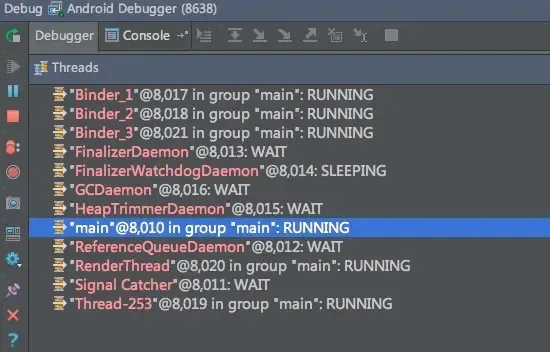 通过debug,我们可以捕获当前应用程序中的线程(如下图),其中蓝色选中部分即为当前应用程序的主线程,当前程序中还运行了三个Binder,每个Binder对象都对应一个线程,这些Binder线程主要负责接收Linux Binder驱动发送的IPC调用。除此以外还有Java中的守护线程和垃圾回收线程堆裁剪守护进程等在运行。