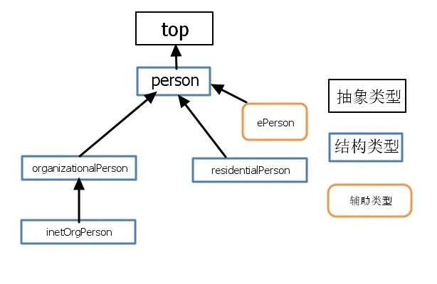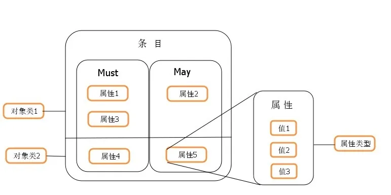 通过对象类可以方便的定义条目类型。每个条目可以直接继承多个对象类,这样就继承了各种属性。如果2个对象类中有相同的属性,则条目继承后只会保留1个属性。对象类同时也规定了哪些属性是基本信息,必须含有(Must 活Required,必要属性):哪些属性是扩展信息,可以含有(May或Optional,可选属性)。