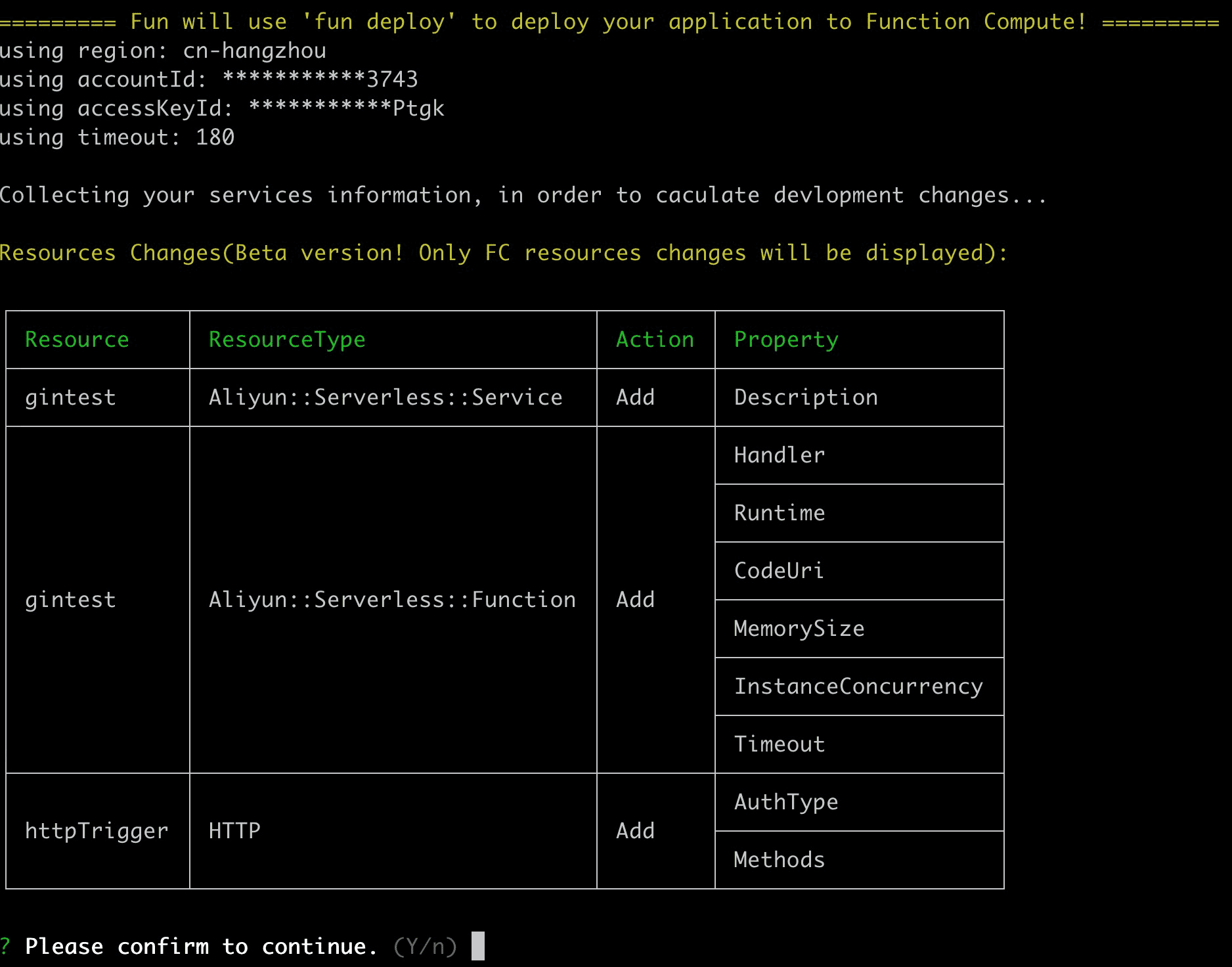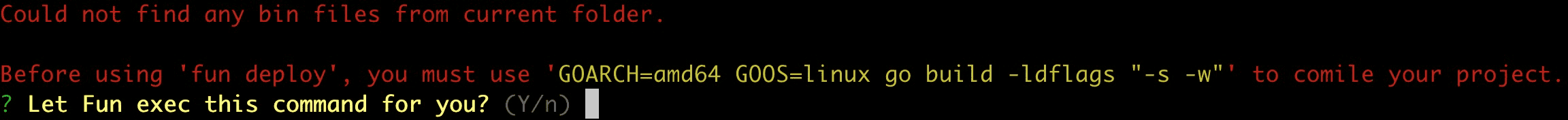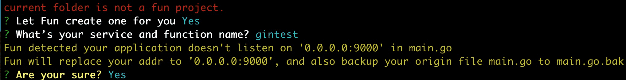 - Fun 首先检测到这不是一个 Fun 项目,会提示是否自动创建(按下回车或者输入 y 即可)