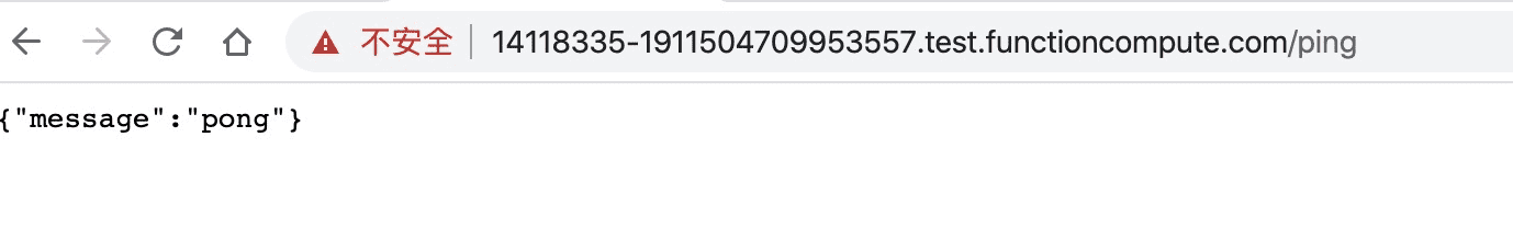 使用该临时域名,访问应用的 API 接口 14118335-1911504709953557.test.functioncompute.com/ping
