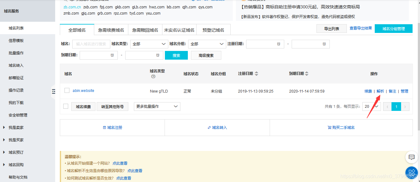- 登录阿里云,进入控制台,找到域名,然后点击解析