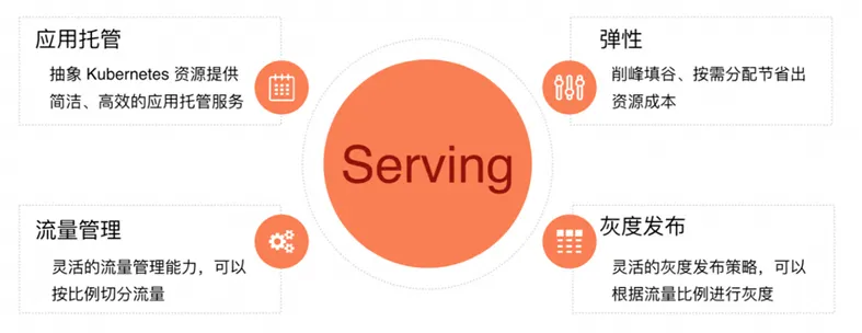 Serving 通过与 Istio 结合还提供了强大的流量管理能力和灵活的灰度发布能力。流量管理能力可以根据百分比切分流量,灰度发布能力可以根据流量百分比进行灰度,同时灰度发布能力还能通过自定义 tag 的方式进行上线前的测试,非常便于和自己的 CICD 系统集成。
