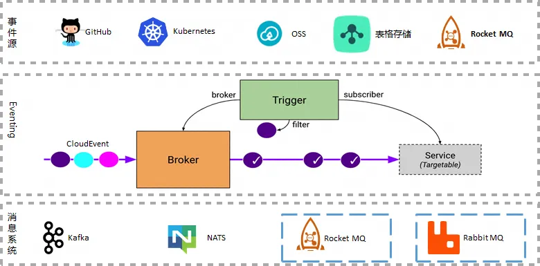 - 兼容现有消息系统:KnativeEventing 充分解耦了消息系统的实现,目前除了系统自身支持的基于内存的消息通道 InMemoryChannel 之外,还支持 Kafka、NATSStreaming 等消息服务,此外可以方便的对接现有的消息系统。