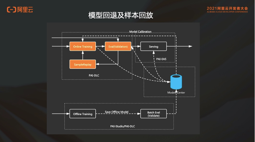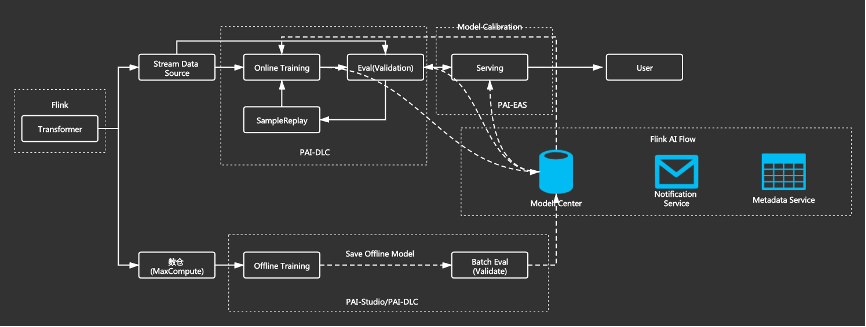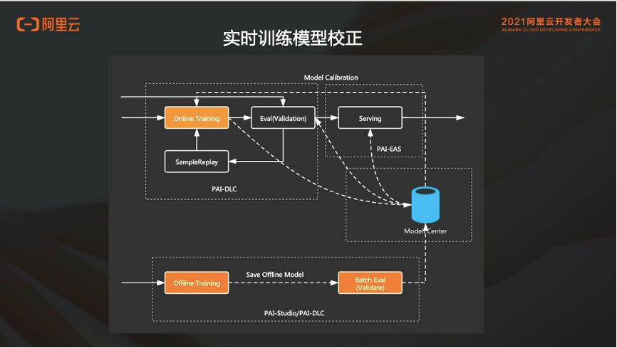 离线流这边有一条线叫 model calibration,也就是模型的校正。离线训练生成 T+1 的模型会对在线训练进行模型的校正。