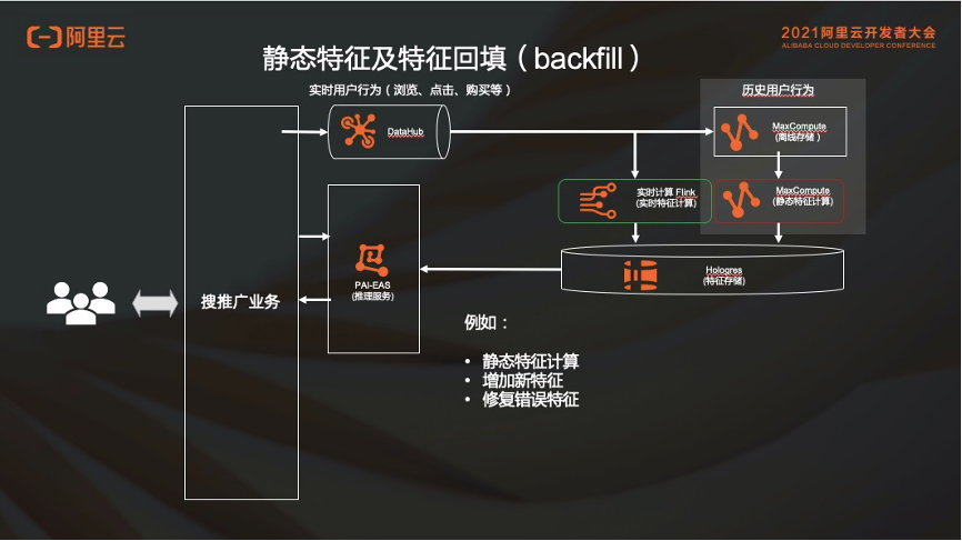 比如新上线一个特征,这个新的特征在实时链路上线了之后,如果需要最近 30 天用户的行为,不可能等 30 天之后再计算。于是需要找到离线数据,然后把最近 30 天的这个特征给它补上。这就叫特征回填,也就是 backfill 。通过 MaxCompute 去算这个特征回填一样也是写到 Hologres,同时实施起来也会把新的特征给加上,这是一个新特征的场景。