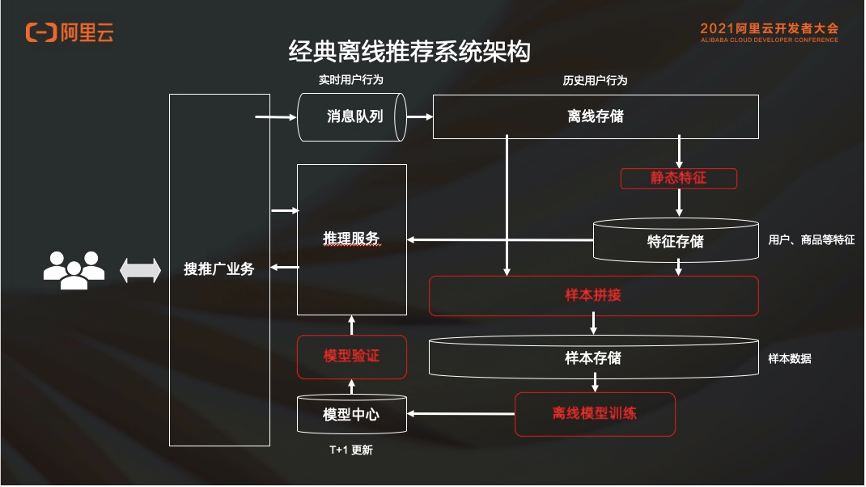 首先,用户群行为会从消息队列来走离线存储,然后这个离线存储会存储所有的历史用户行为;然后在这个离线存储上面,通过静态特征计算样本;接下来把样本存到样本存储里,去做离线模型训练;之后把离线的这个模型发布到模型中心,去做模型验证;最后把模型验证过的模型推到推理服务去服务在线业务。这个就是完整的离线体系。