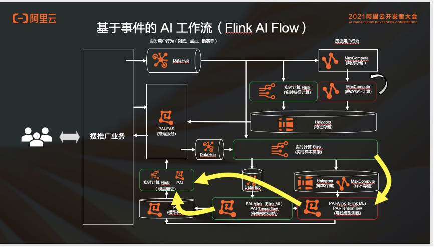消息队列会用 DataHub;实时的特征和样本使用实时计算Flink版;离线的特征存储和静态特征计算都会用 MaxCompute;特征存储和样本中心使用 MaxCompute 交互式分析(Hologres);消息队列的部分都是 DataHub;模型训练的部分会用到 PAI,模型存储和验证,还有在线推理服务这一套流程都是 PAI 里面的。