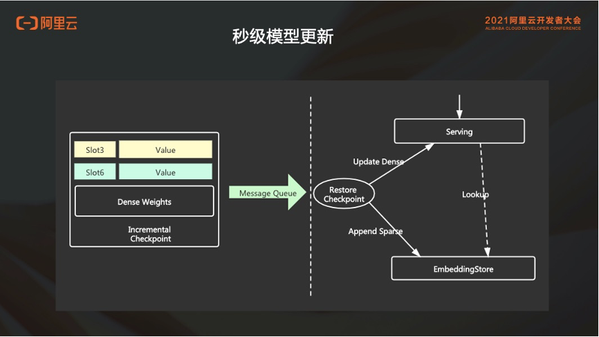 增量模型是说可以把一分钟内稀疏特征变化的部分记录下来,产生到这个增量模型中。增量模型记录了稀疏的变化的特征和全量 Dense 的参数。