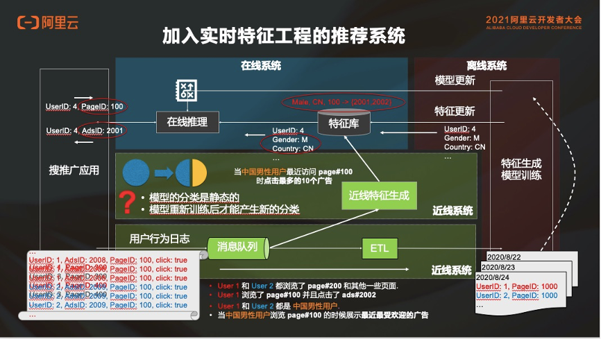 在推荐系统中加入实时特征工程,把消息队列里面的消息读一份出来,然后去做近线的特征生成。举个例子,中国男性用户最近访问 page#100 的时候点击最多的 10 个广告,这件事情是实时去追踪的。就是说中国男性用户最近 10 分钟或者半个小时之内访问 page#100 的时候点的最多 10 个广告,个事情不是从昨天的历史数据里面得到的信息,而是今天的用户实时行为的数据,这就是实时特征。