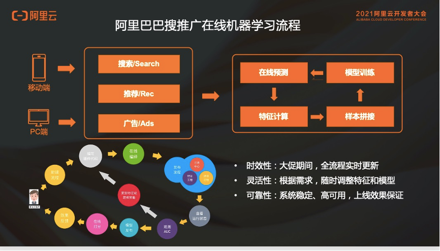 这个推荐模型从图上看,从特征到样本到模型,再到在线预测这个过程,和离线其实没有区别。主要的区别就是整个的流程实时化,用这套实时化的流程去服务在线的搜索推广应用。