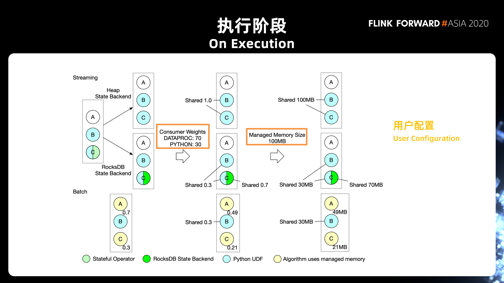 - 而对于第二种情况(Streaming 的 RocksDB State Backend 分支),B、C 的这两个 Operator 共用 30% 的内存用于 Python 的 UDF,另外 C 再独享 70% 的内存用于 RocksDB State Backend。最后 Flink 会根据 Task manager 的资源配置,一个 slot 当中有多少 manager memory 来决定每个 operator 实际可以用的内存的数量。