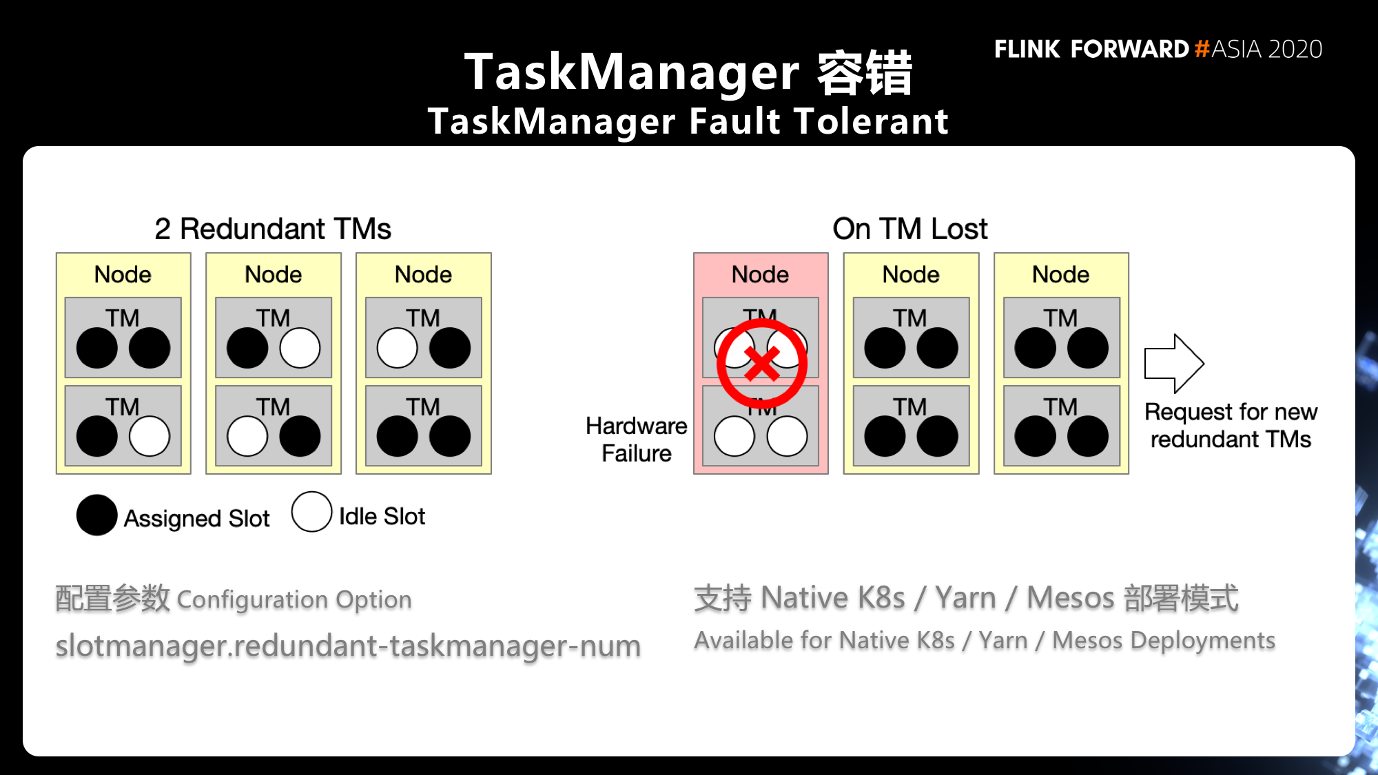 对于稳定性要求相对比较高的作业,Flink1.12 提供了一个新的 feature,能够支持在 Flink 集群当中始终持有少量的冗余的 TaskManager,这些冗余的 TaskManager 可以用于在单点故障的时候快速的去恢复,而不需要等待一个重新的资源申请的过程。