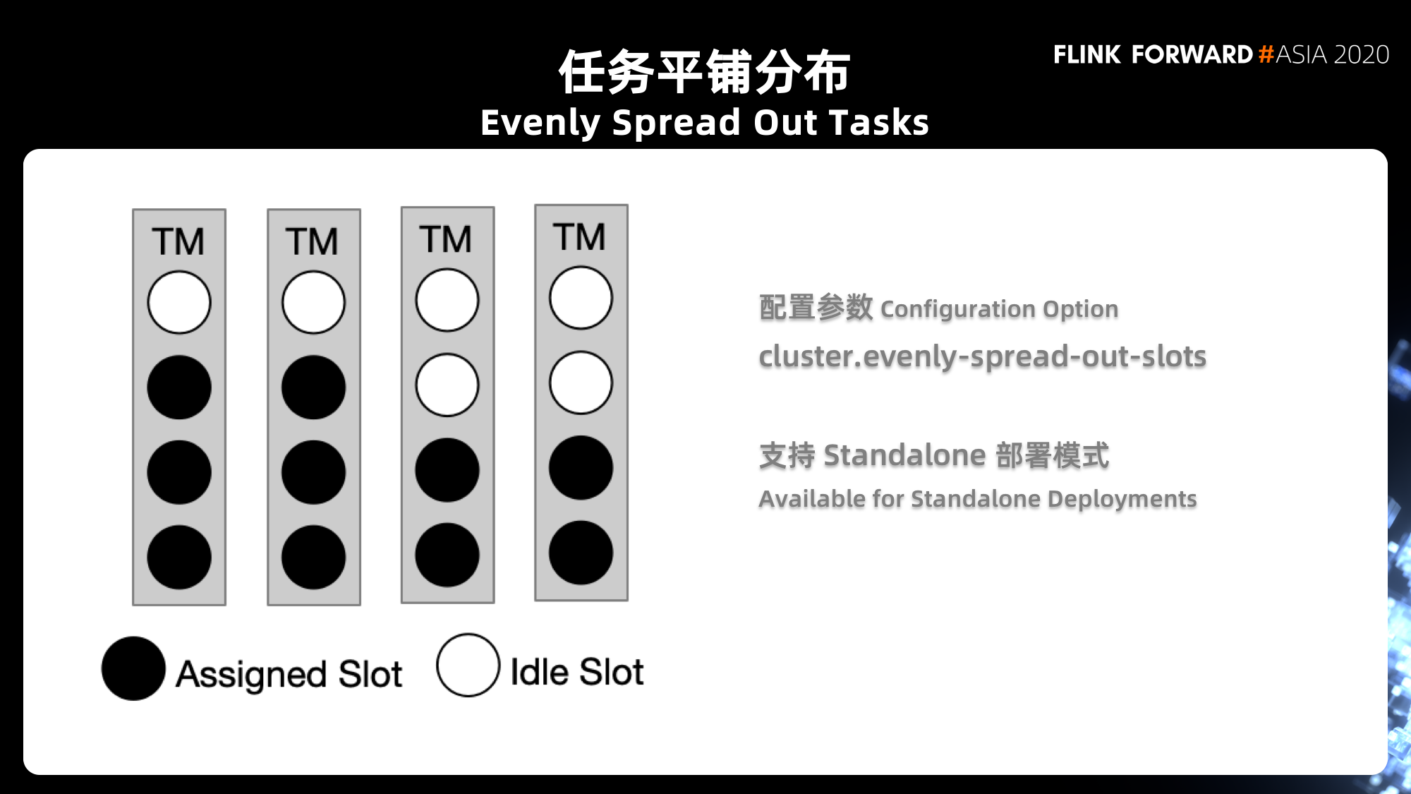 任务可能是相对比较均匀的分布在上面,在能够在利用空闲 TaskManager 的同时,也能够达到一个相对比较好的负载。 一旦发生故障的时候,可以去先把任务快速的调度到现有的还存活的 TaskManager 当中,然后再去进行新一轮的资源申请。目前这个参数支持在 yarn/mesos/native k8 使用。