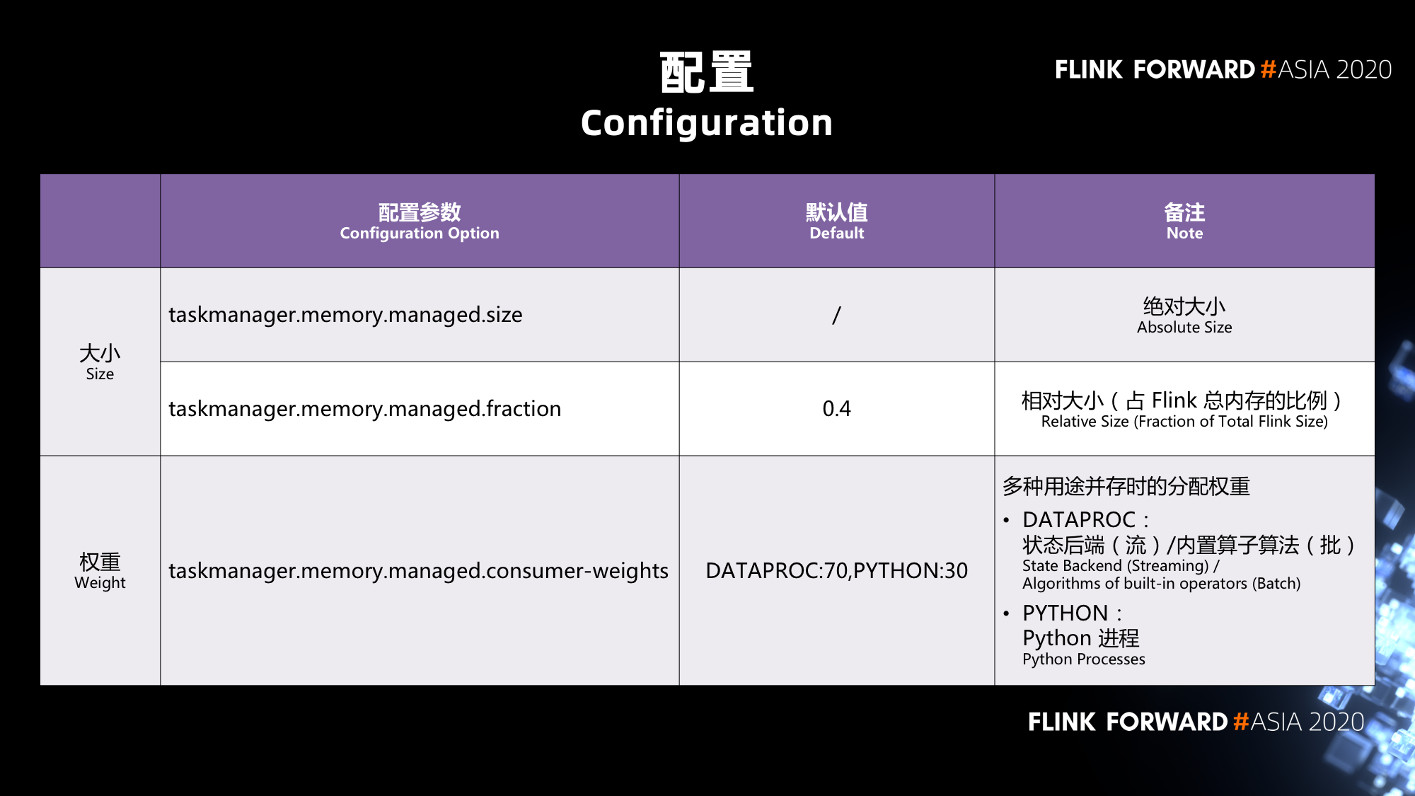 taskmanager.memory.managed.consumer-weight 是一个新加的配置项,它的数据类型是 map 的类型,也就是说我们在这里面实际上是给了一个 key 冒号 value,然后逗号再加上下一组 key 冒号 value 的这样的一个数据的结构。这里面我们目前支持两种 consumer 的 key: