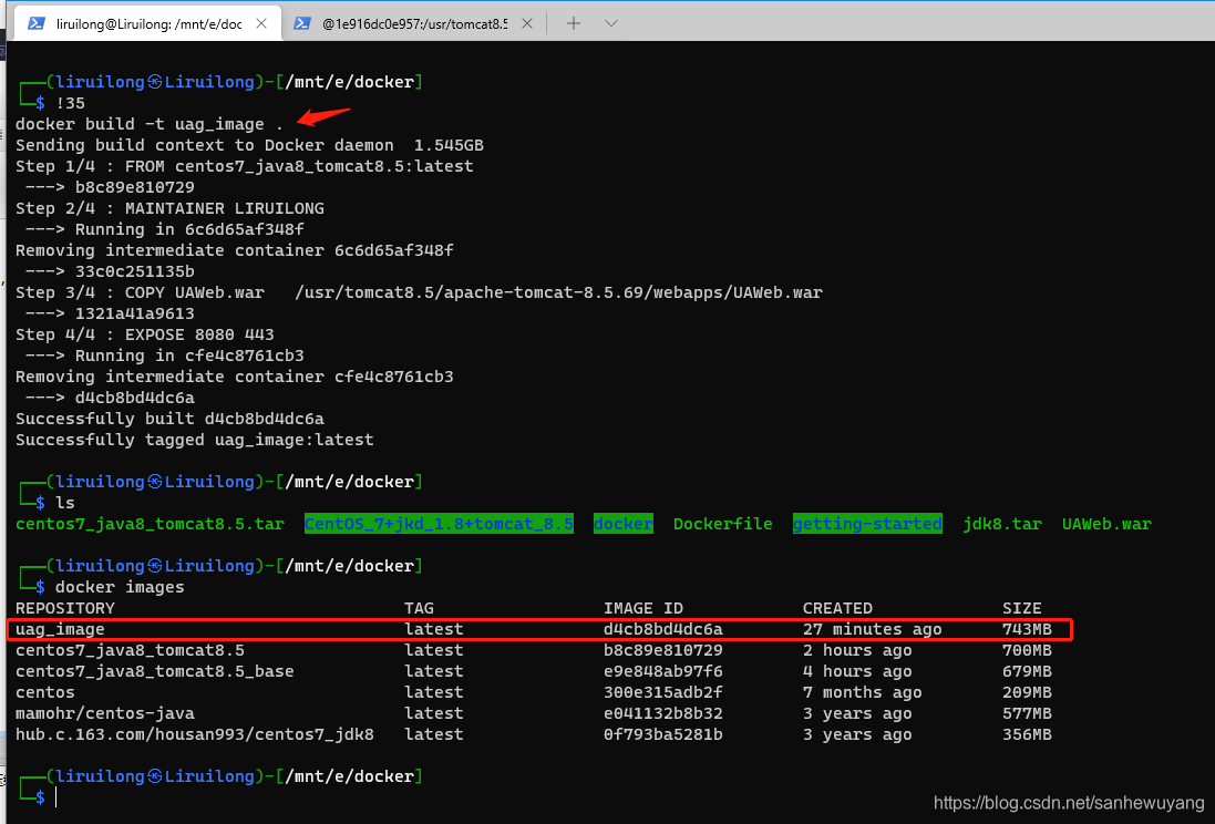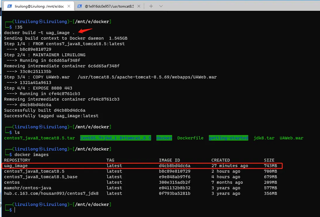 PS E:\docker> docker save centos7_java8_tomcat8.5:latest -o  centos7_java8_tomcat8.5.tar通过 Dockerfile 创建服务镜像